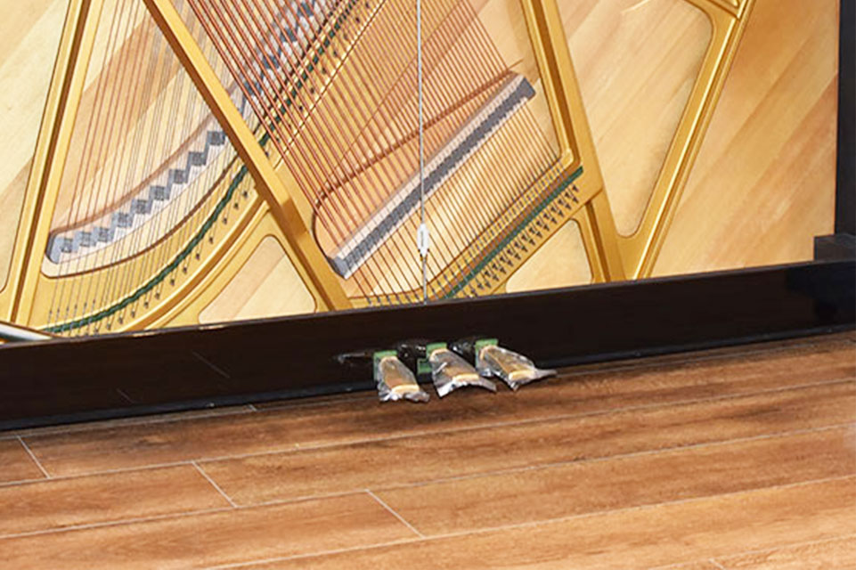 Bộ Pedals có 3 bàn đạp với 3 chức năng khác nhau: soft pedal (hoặc una corda pedal) là giảm âm thanh, tiếp đến là sostenuto pedal là pedal duy trì và cuối cùng là damper pedal (hoặc sustain pedal) là pedal vang âm. Chất liệu của bộ Pedals được đúc từ hợp kim đồng nên rất chắc chắn và màu vàng sáng bóng tạo nên vẻ sang trọng hơn cho cây đàn piano.
